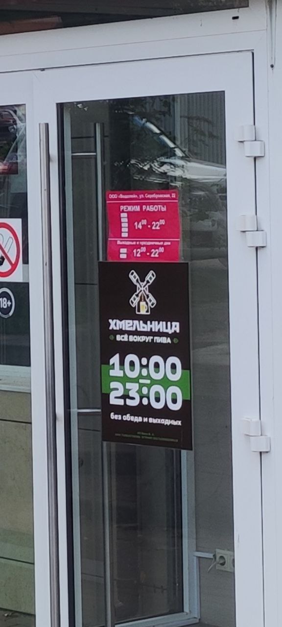 Интересно и то, что заведение работает под двумя вывесками. Так, на одну из них есть лицензия на розничную торговлю и режим работы и продажи алкоголя там указан по закону - с 14 до 22 часов. А вот на второй вывеске, на которой и указано основное название - режим работы с 10 до 23 часов. Алкоголь в магазине продают с 10 до 14 часов в открытом виде, а с 14 - в закрытом.