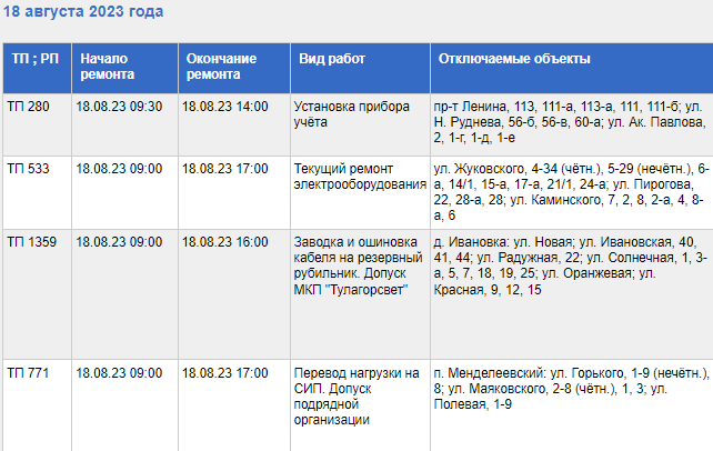 Десятки адресов Тулы, деревни Ивановка и поселка Менделеевский останутся без электричества из-за плановых работ, в том числе установки приборов, ремонта и т.д.