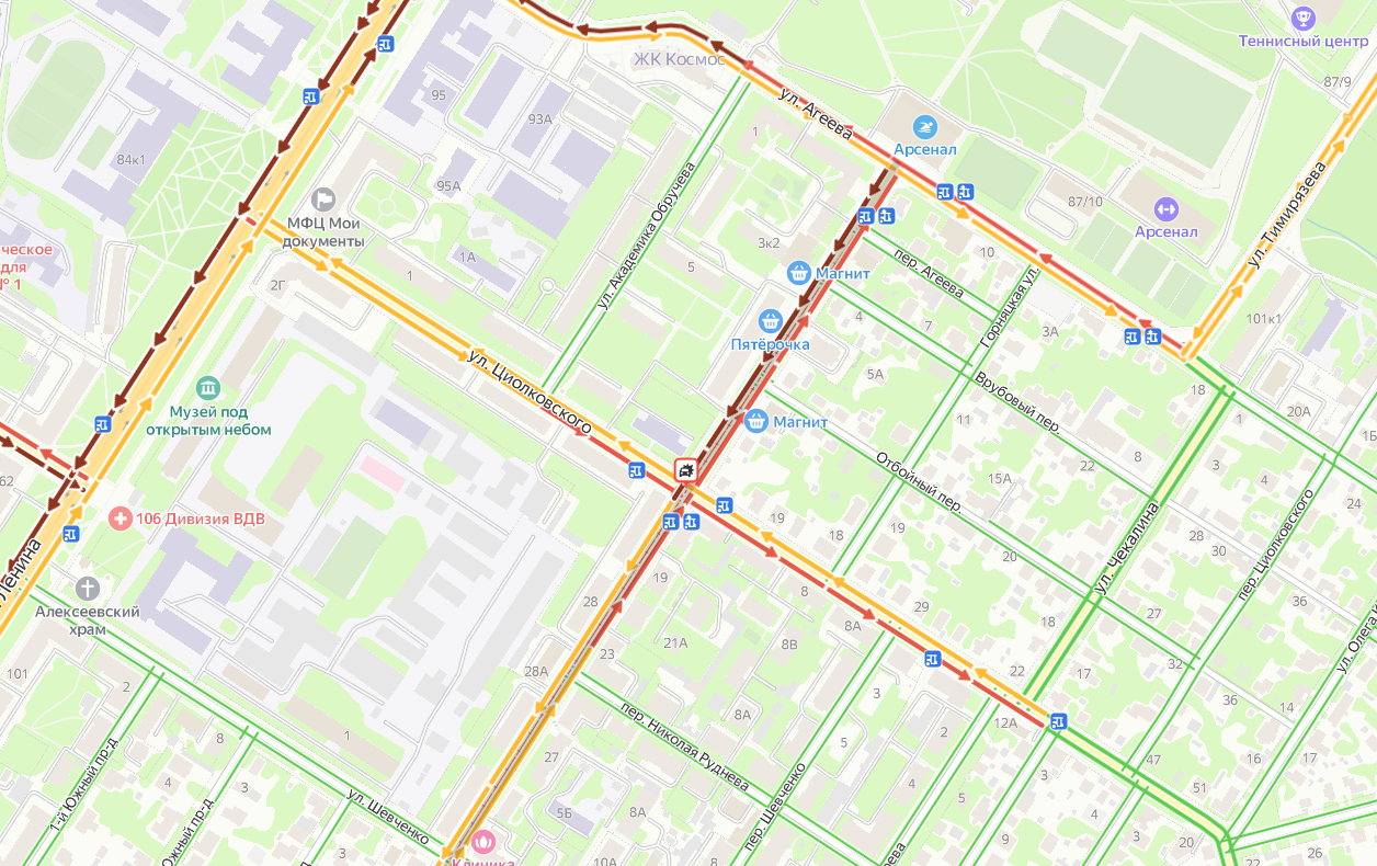 Судя по фотографиям, авария мешает движению машин, автобусов и трамваев в обе стороны. На онлайн-картах улица окрашена в бордовый цвет.