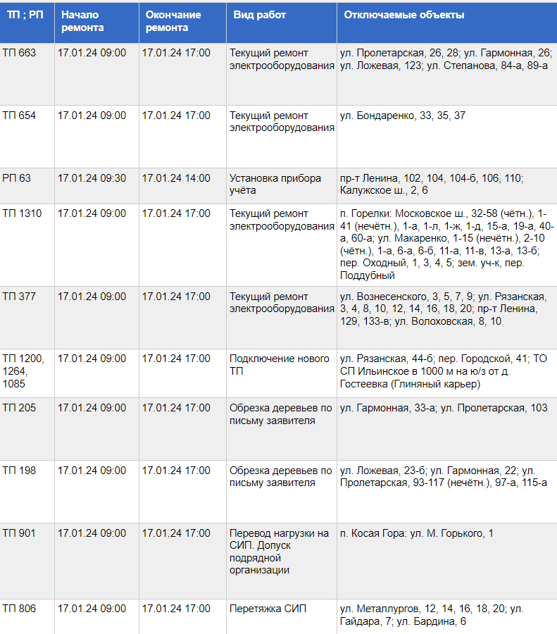 Подробный список адресов, по которым не будет света, приведен ниже: