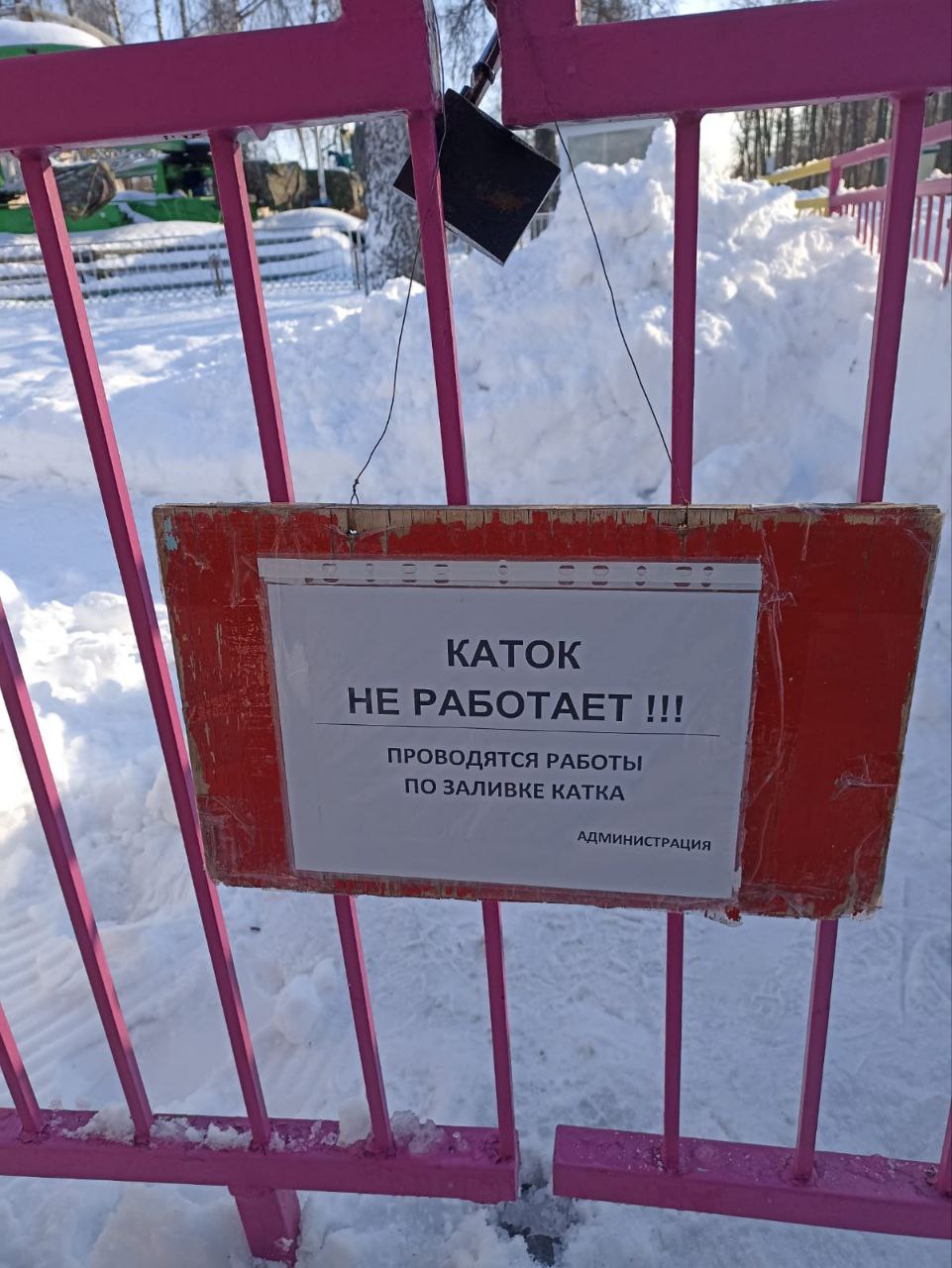 Соответствующее объявление появилось у входа на ледовую площадку. Каток закрыли из-за проведения работ по восстановлению ледового покрытия.