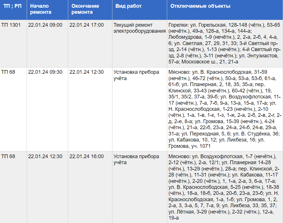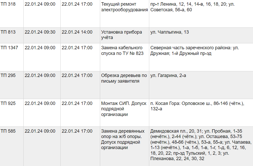 Публикуем график проведения работ, а также список адресов, жители которых временно останутся без электричества: