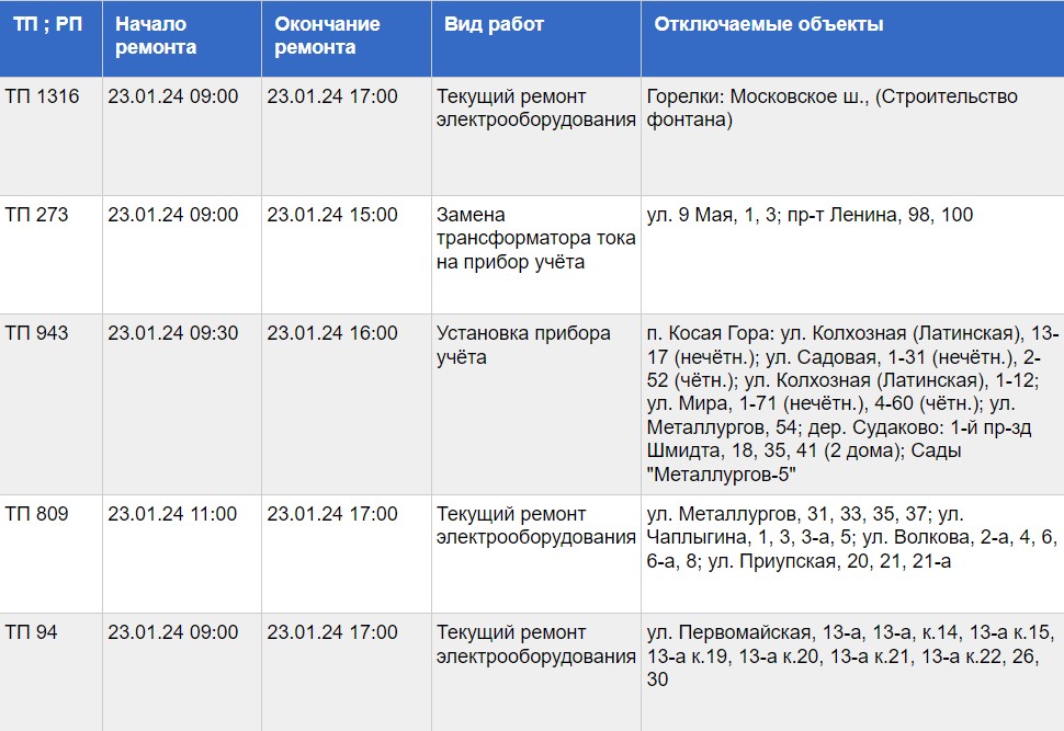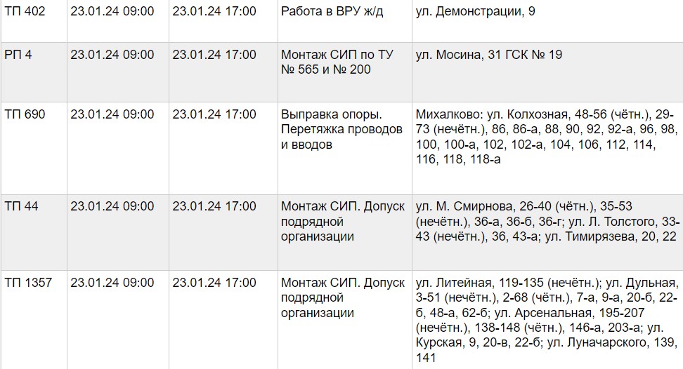 Публикуем график проведения работ и список адресов, по которым временно ограничат подачу электричества: