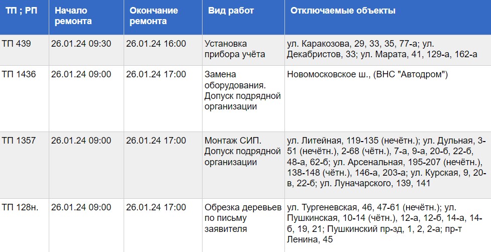 Публикуем график проведения работ и список адресов, жители которых временно останутся без электричества:
