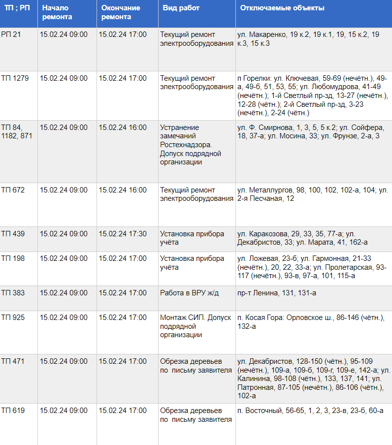 Света не будет с 9 до 17 часов. Это связано с плановыми работами, такими как текущий ремонт, установка приборов, обрезка деревьев и т.д.