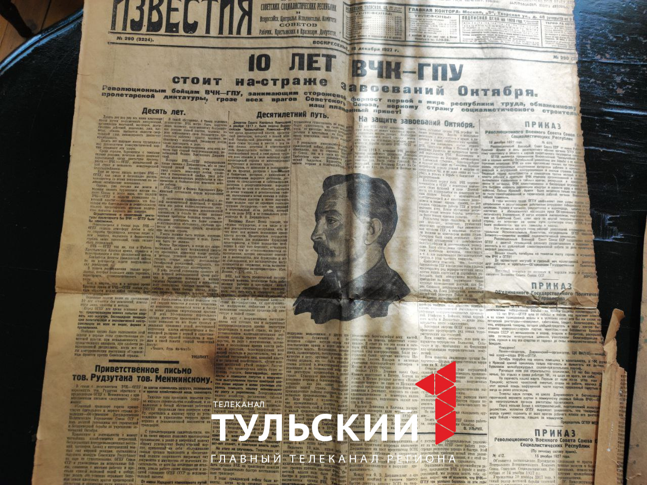 Вторая найденная газета называется «Всесоюзные Известия». На первой полосе - поздравления с 10-летним юбилеем Всероссийской чрезвычайной комиссии по борьбе с контрреволюцией и саботажем и портрет ее руководителя Феликса Дзержинского. Там же объявление о присвоении государственных наград советским гражданам. Так орден Красного Знамени получил первый в истории СССР комиссар госбезопасности Генрих Ягода, который будет расстрелян в 1938 году.