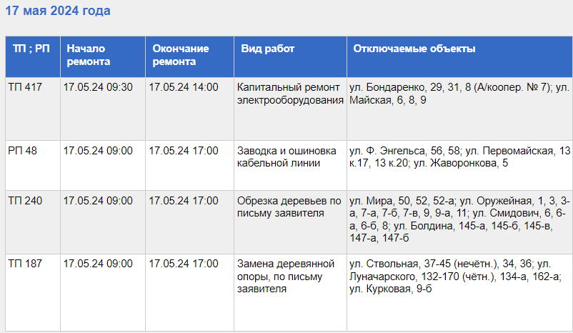 Электричества не будет в десятках домов примерно с 9 до 17 часов.