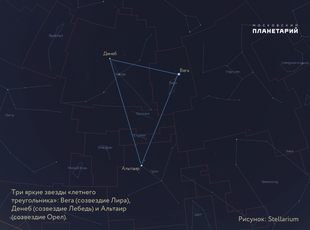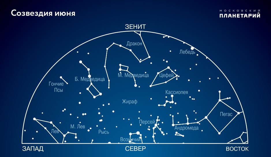 Большую Медведицу можно будет увидеть слева от Полярной звезды. А Млечный Путь протянется над восточным горизонтом в виде дуги от севера до юга. В области зенита можно будет увидеть Голову Дракона. А созвездия Лебедь, Лира и Орёл, самые яркие звёзды которых – Денеб, Альтаир и Вега – образуют «Летний Треугольник». Они будут хорошо видны над юго-восточным горизонтом после полуночи.