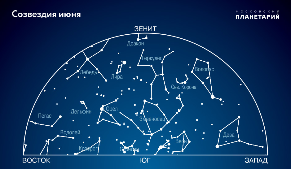 В южной стороне неба над горизонтом поднимутся Стрелец и Змееносец, а слева от него засияют Орёл и Дельфин. На северо-западе можно будет наблюдать за Северной Короной и Волопасом.