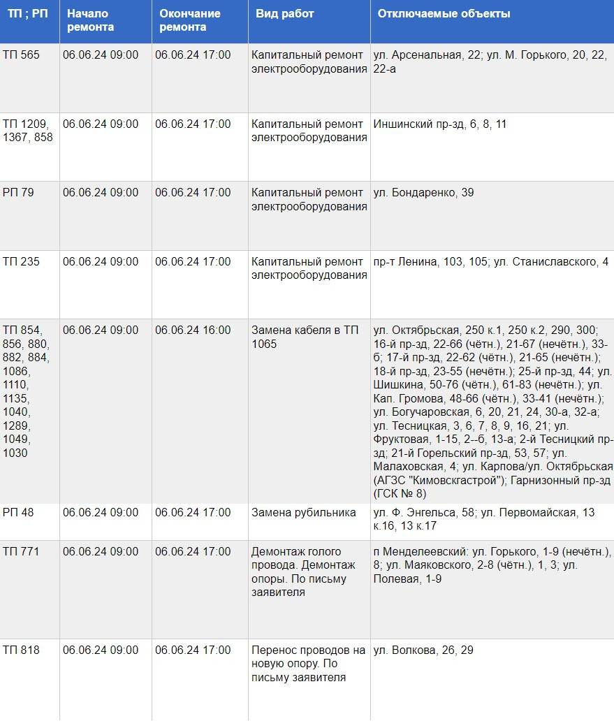 Полный список адресов, где в четверг не будет света, и график отключений представлены ниже:
