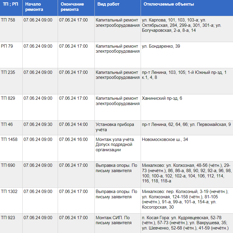 Света по большинству адресов не будет с 09:00 до 17:00 из-за капитального ремонта электрооборудования, выправки опоры, монтажа СИП, монтажа узла учета и установки приборов учета.