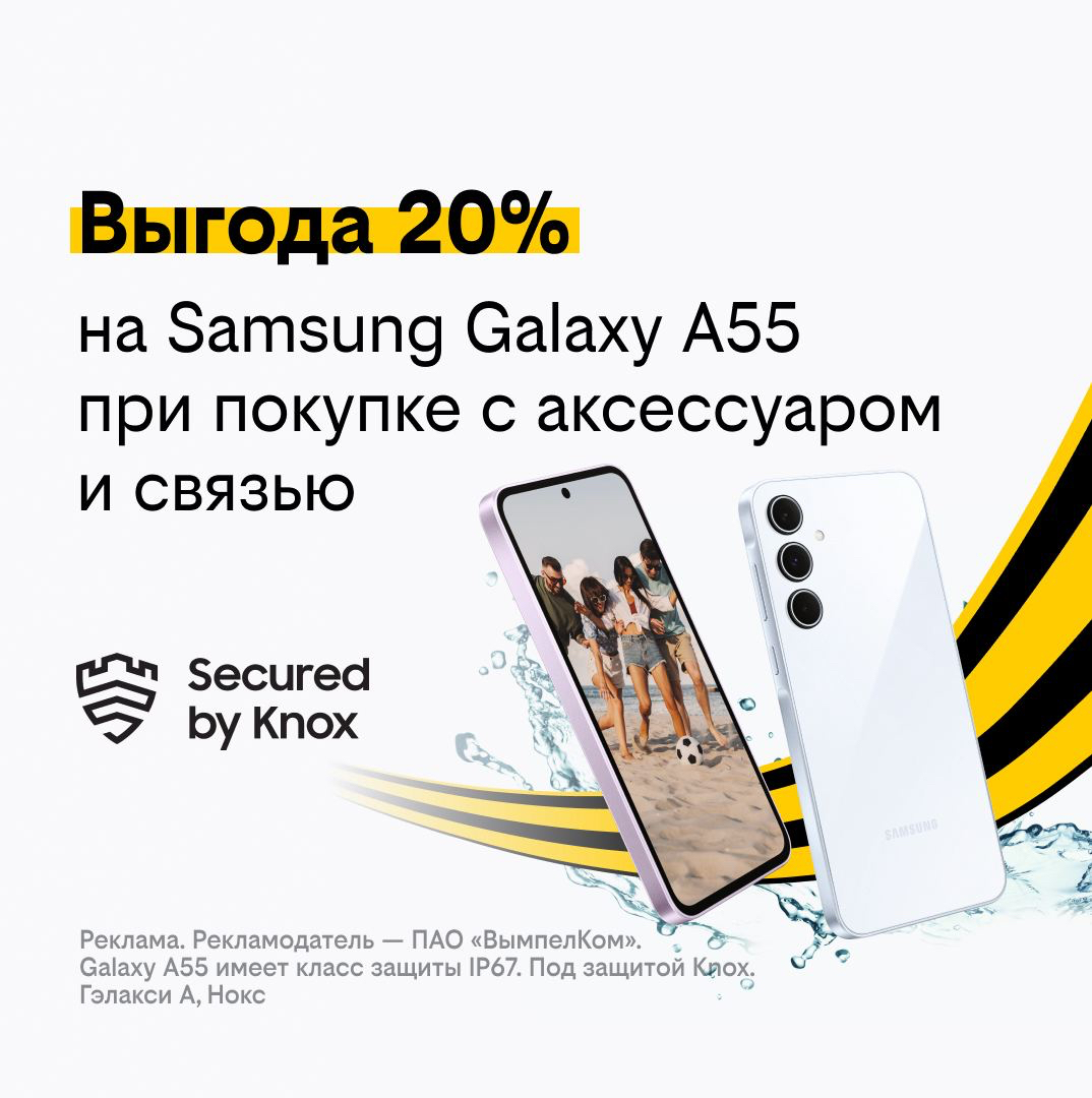 В интернет-магазине и офисах обслуживания билайна в рамках акции «Летний марафон выгод» доступны популярные модели брендов Samsung, Xiaomi, TECNO, Honor и Realme. Одна из интересных моделей акции — это новинка популярной серии Samsung — Samsung Galaxy A55 256 Гб. Защита от влаги и пыли, экран, который не выцветает под лучами солнца, мощный процессор, возможность быстрой зарядки и первоклассная камера — все, что нужно для летнего сезона. Эту современную новинку в рамках акции в билайне можно приобрести с выгодой в 20%.