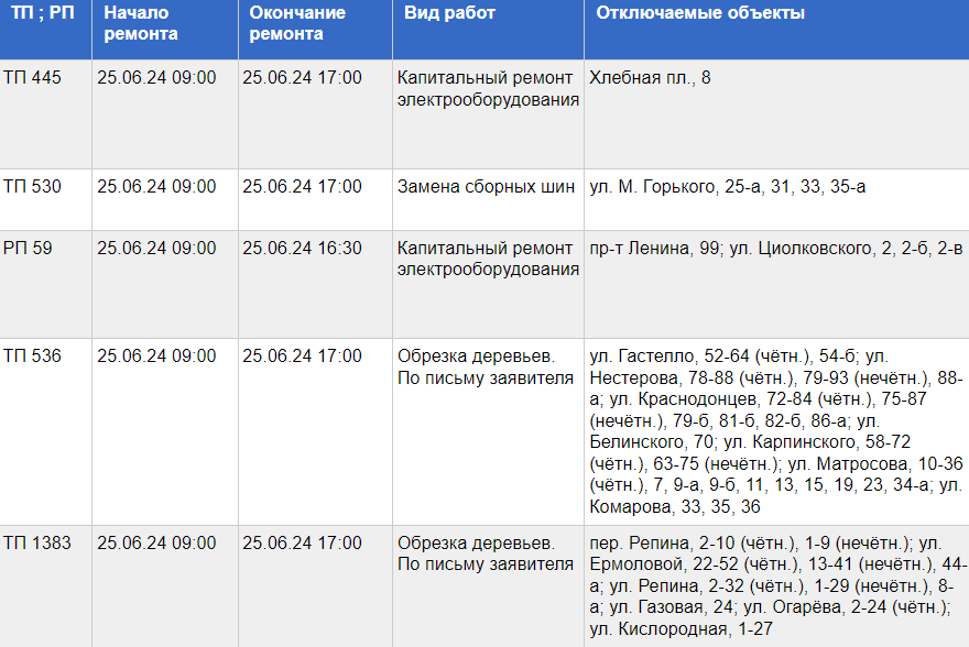 Электричества не будет из-за плановых работ, таких как капитальный ремонт электрооборудования, обрезка деревьев и замена сборных шин.