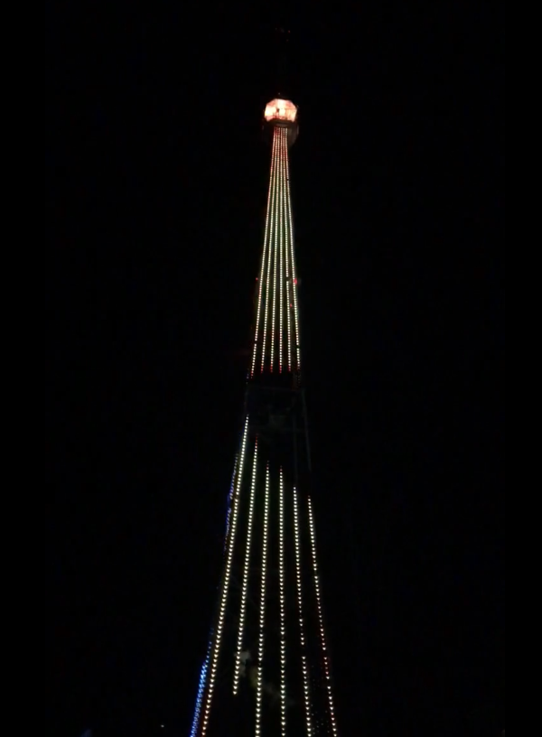 Иллюминация тульской телебашни включает 6 084 светодиодных светильника. А на отметках 140, 148 и 180 метров установлены 10 мощных полноцветных прожекторов заливного света. Кроме того, по всем граням телевышки смонтированы пиксельные светодиодные гирлянды. Их протяженность — более 3 648 метров.