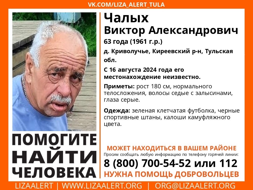 Пропал Чалых Виктор Александрович, 63 года, проживает в деревне Криволучье Киреевского района.