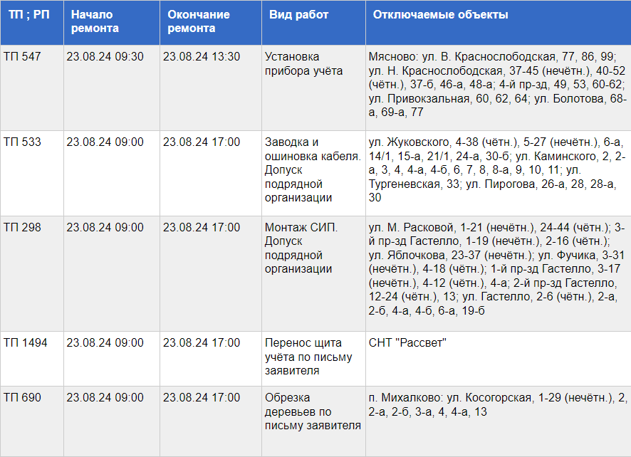 Причина отключений – плановые ремонтные работы. Специалисты будут устанавливать приборы учета, выполнять заводку и ошиновку кабеля, обрезать деревья, переносить щит учета, монтировать самонесущие изолированные провода.