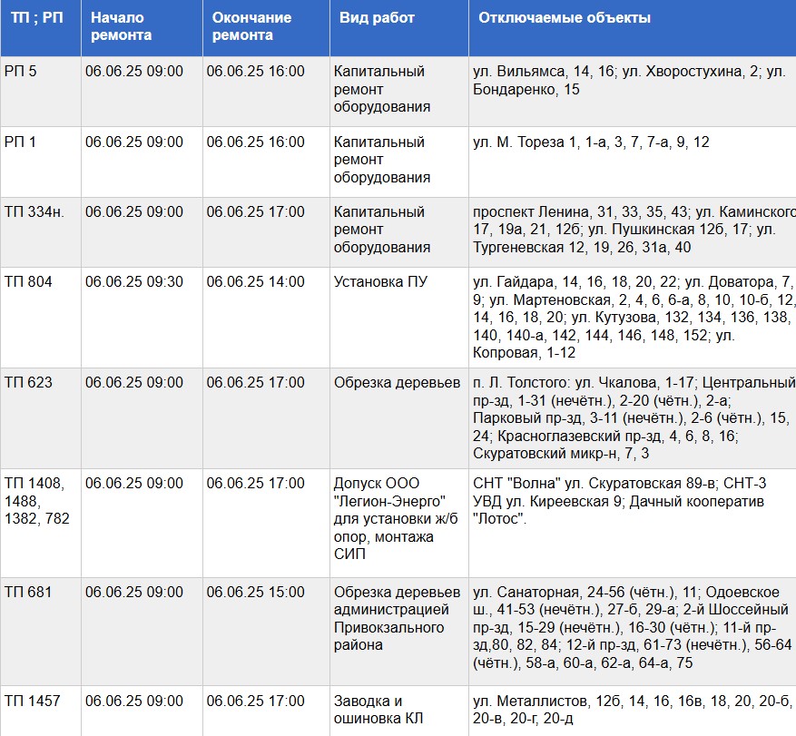 Работы запланированы с 09:00 до 17:00. По некоторым адресам свет включат на несколько часов раньше.