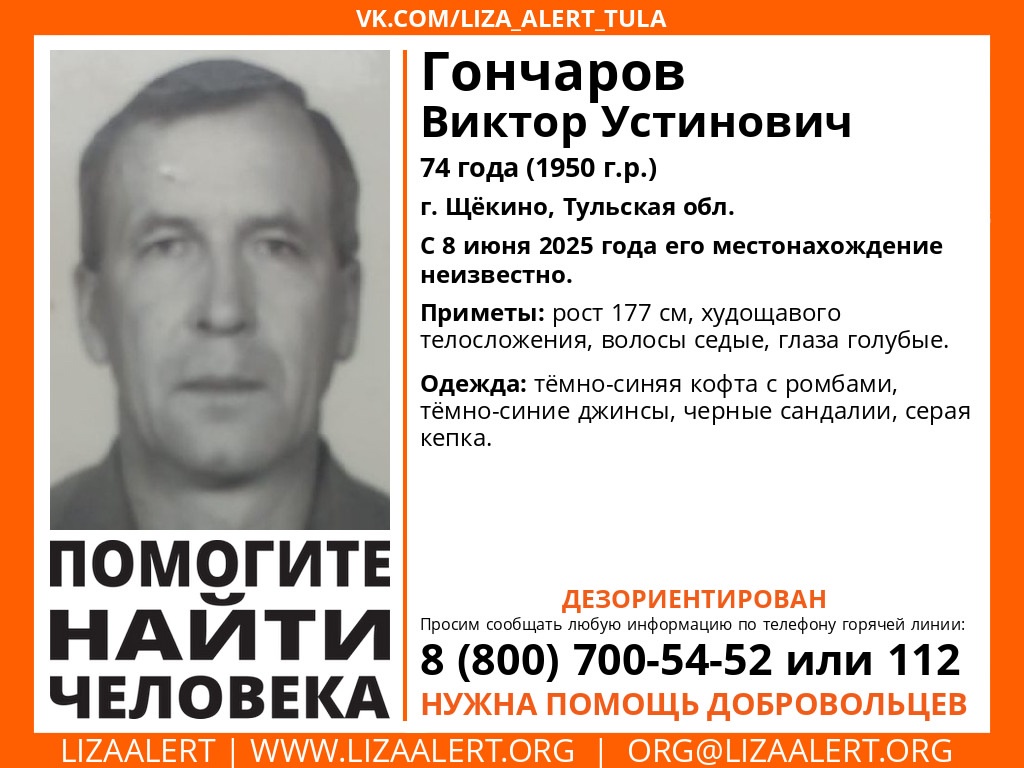 В городе Щекино пропал 74-летний пенсионер. Об этом сообщает поисковый отряд "ЛизаАлерт".