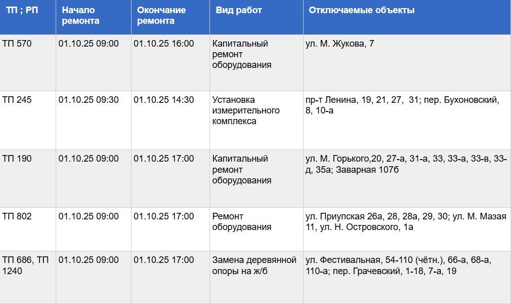 Публикуем график проведения работ и список адресов, жители которых на время останутся без электричества: