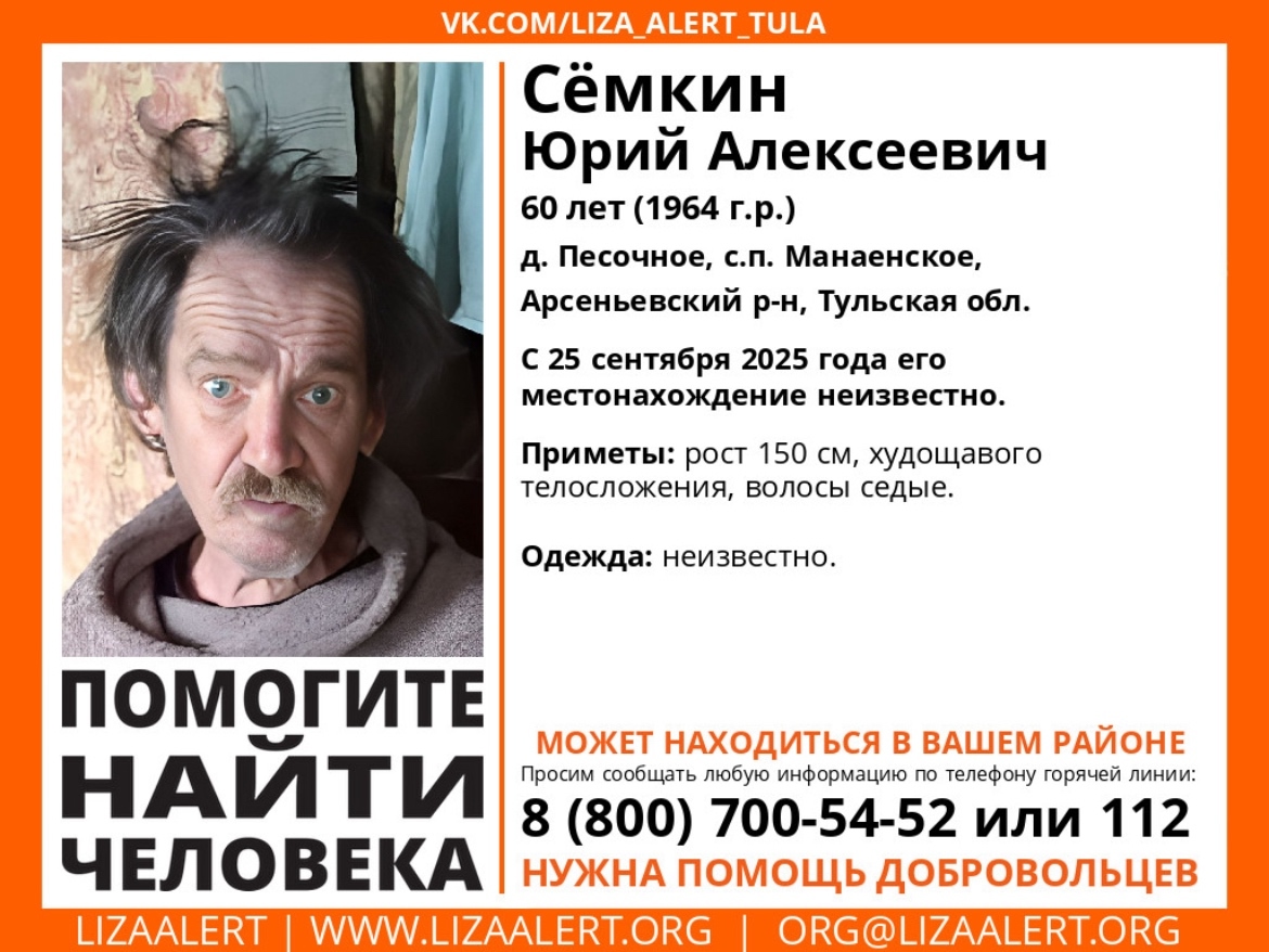 В Тульской области ищут 60-летнего Юрия Алексеевича Семкина из деревни Песочное Арсеньевского района.