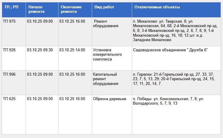 Света не будет с 09:00 до 16:00 из-за капитального ремонта электрооборудования, обрезки деревьев, установки измерительного комплекса.