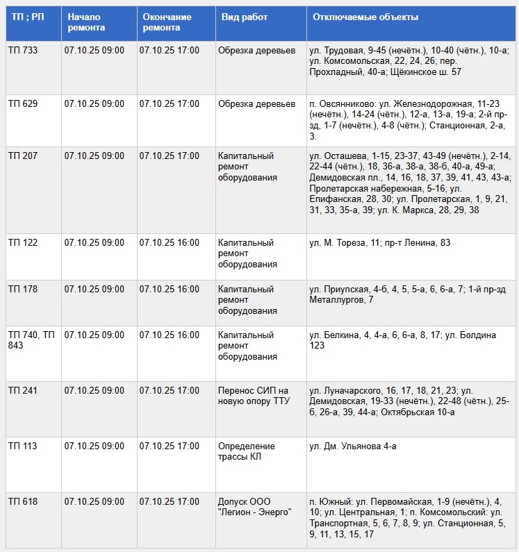 Полный список адресов и график отключений представлены ниже: