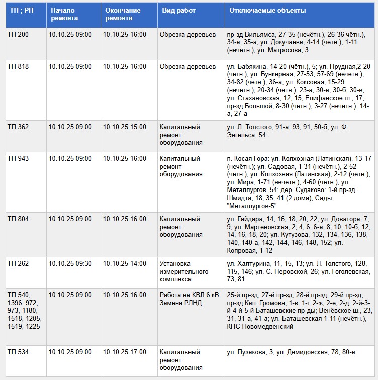 Света не будет с 09:00 до 16:00 из-за капитального ремонта электрооборудования, обрезки деревьев, установки измерительной установки.