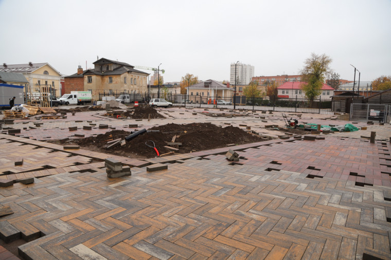 Сейчас в сквере идет устройство плиточного покрытия, монтаж наружного освещения и установка ограждений. Также в сквере установят клумбы, скамейки и камеры видеонаблюдения. Также на участке посадили липы и клены.