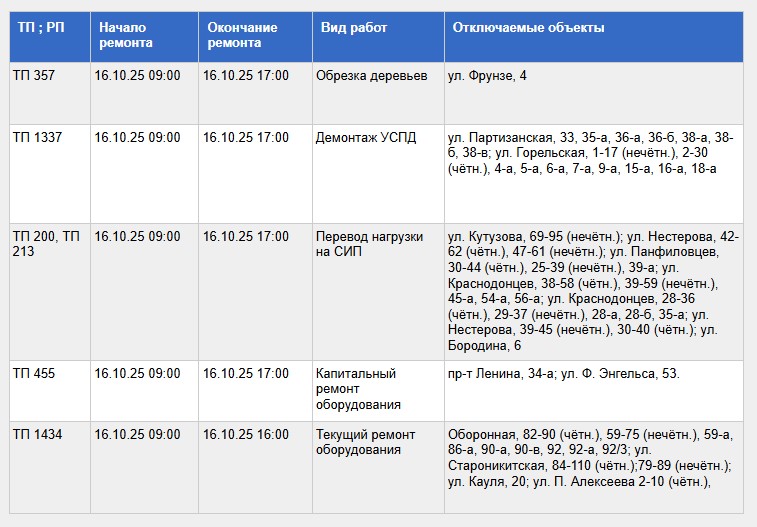 Света не будет с 09:00 до 17:00 из-за капитального ремонта электрооборудования, обрезки деревьев, перевода нагрузки на СИП.