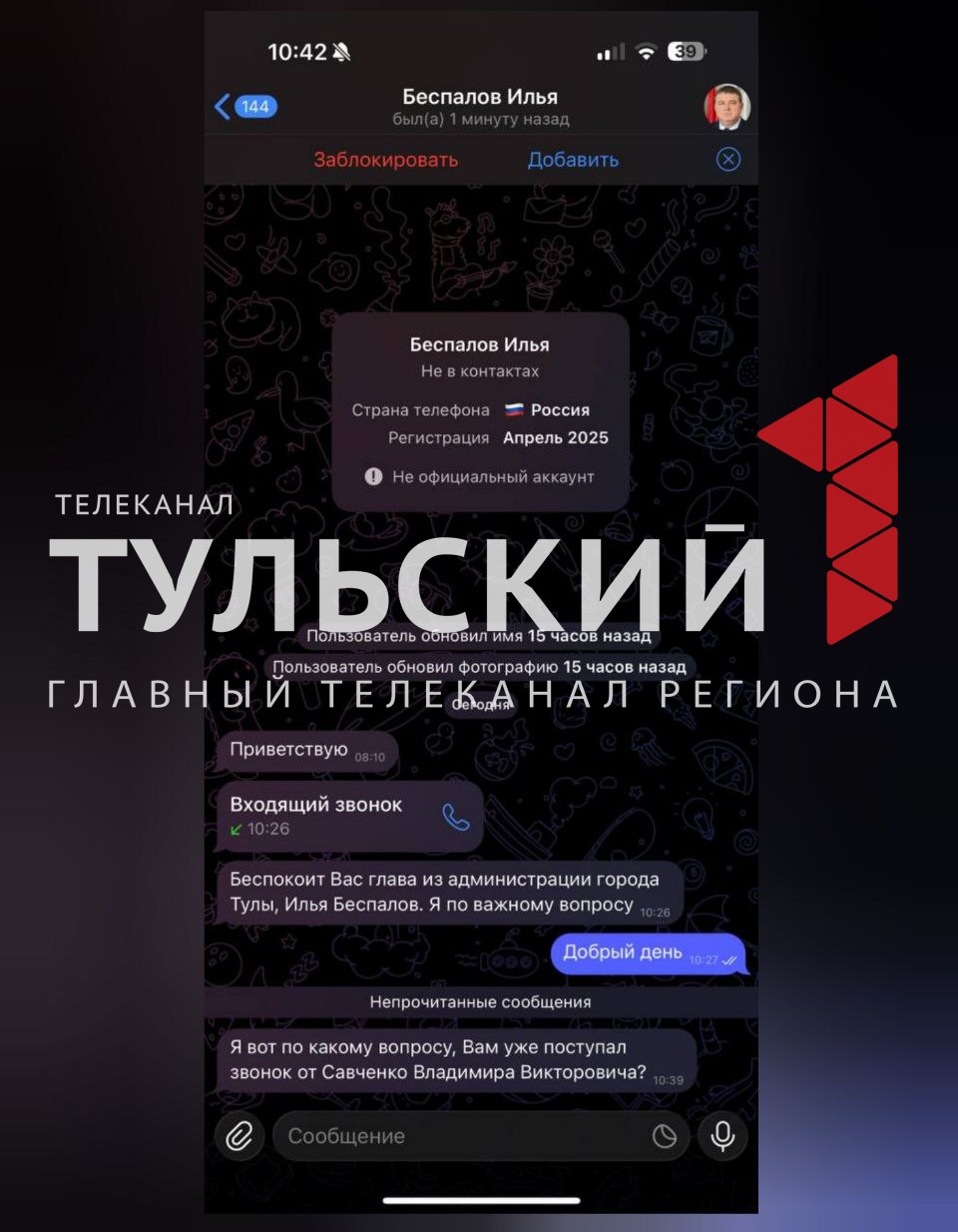 В Туле мошенники начали писать от лица главы Ильи Беспалова. Об этом стало известно "Первому Тульскому" из собственных источников.