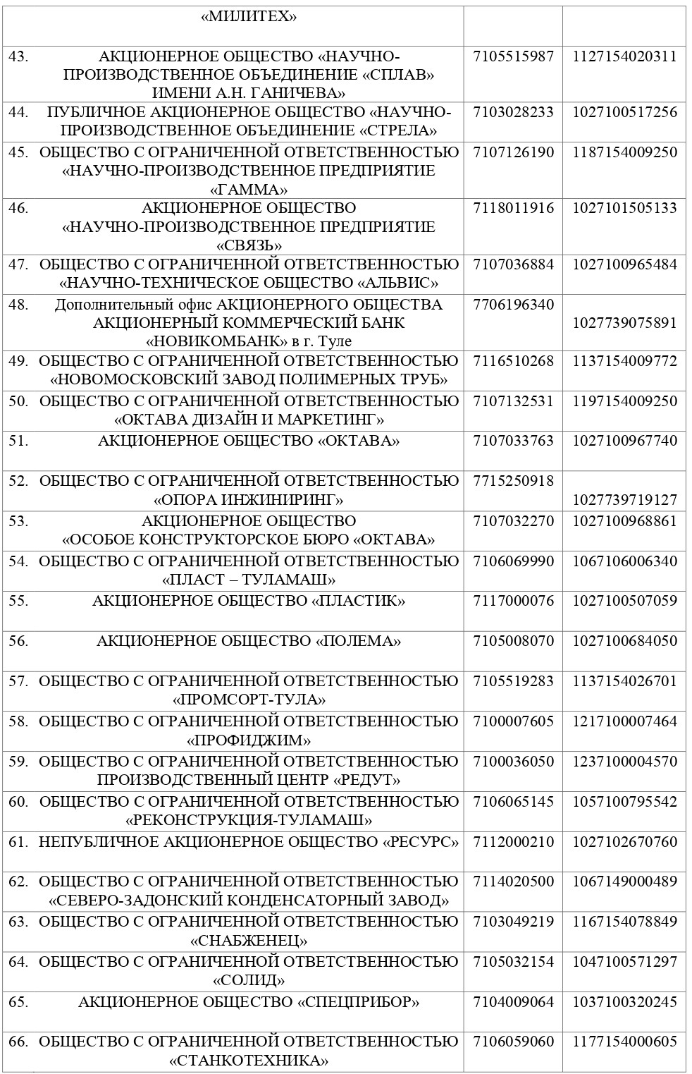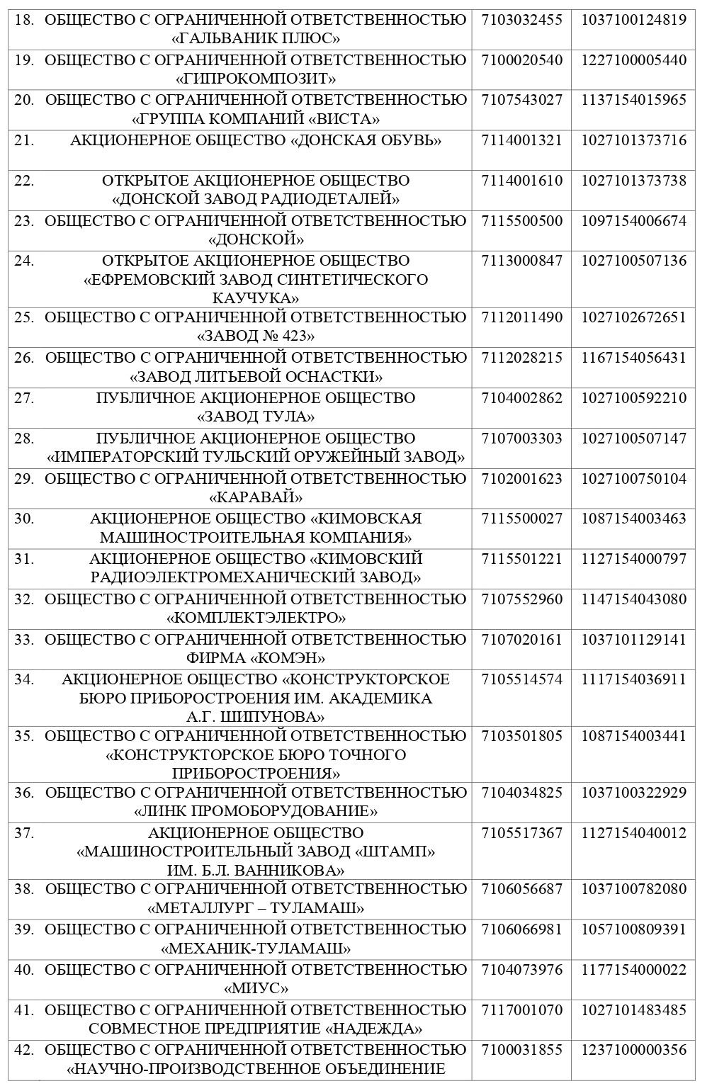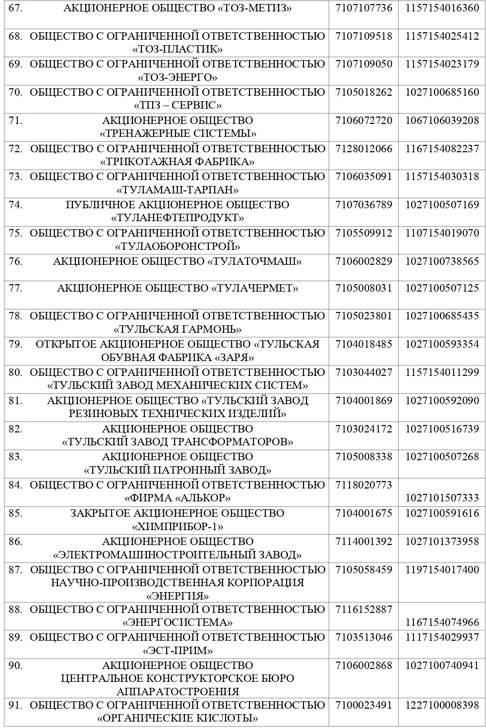 Так, в список попали 96 организаций, в том числе и оборонные предприятия региона – «Сплав», оружейный завод, КБП, патронный завод, механический завод в Алексине и многие другие.