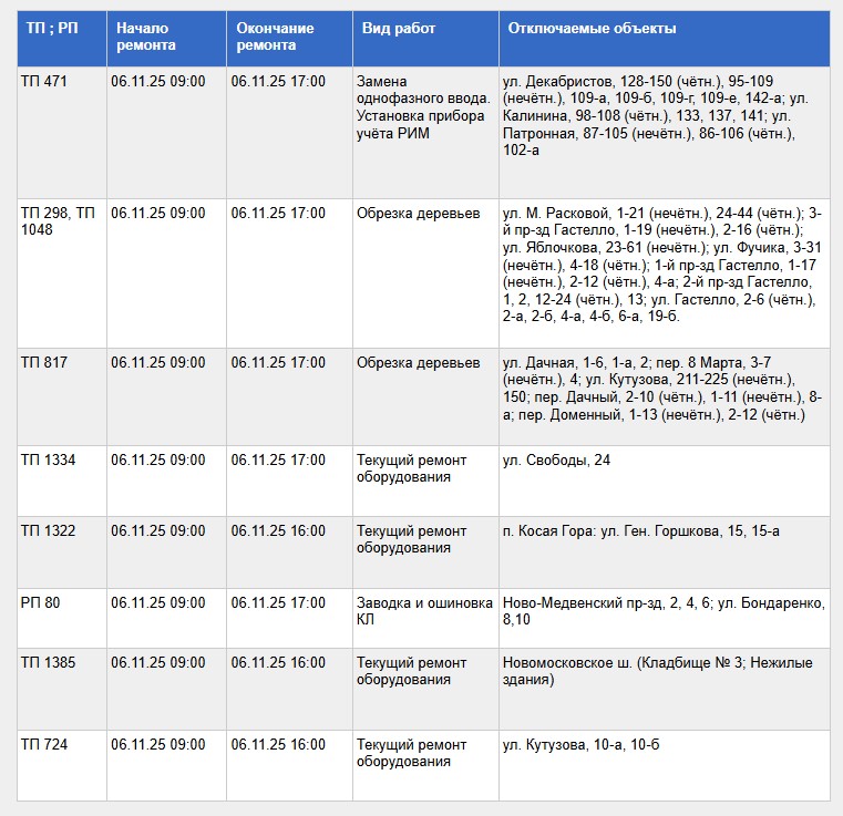 Света не будет с 09:00 до 17:00 из-за капитального ремонта электрооборудования, обрезки деревьев, установки прибора учета и заводки и ошиновки проводов.