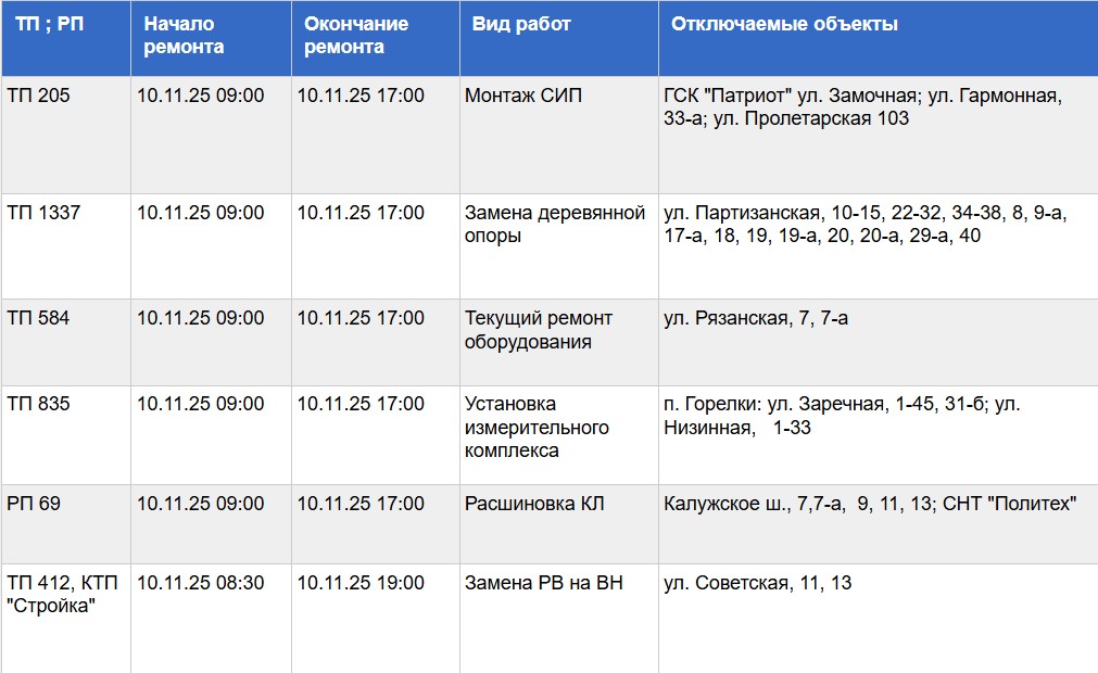 Публикуем график проведения работ и список адресов, жители которых временно останутся без электричества: