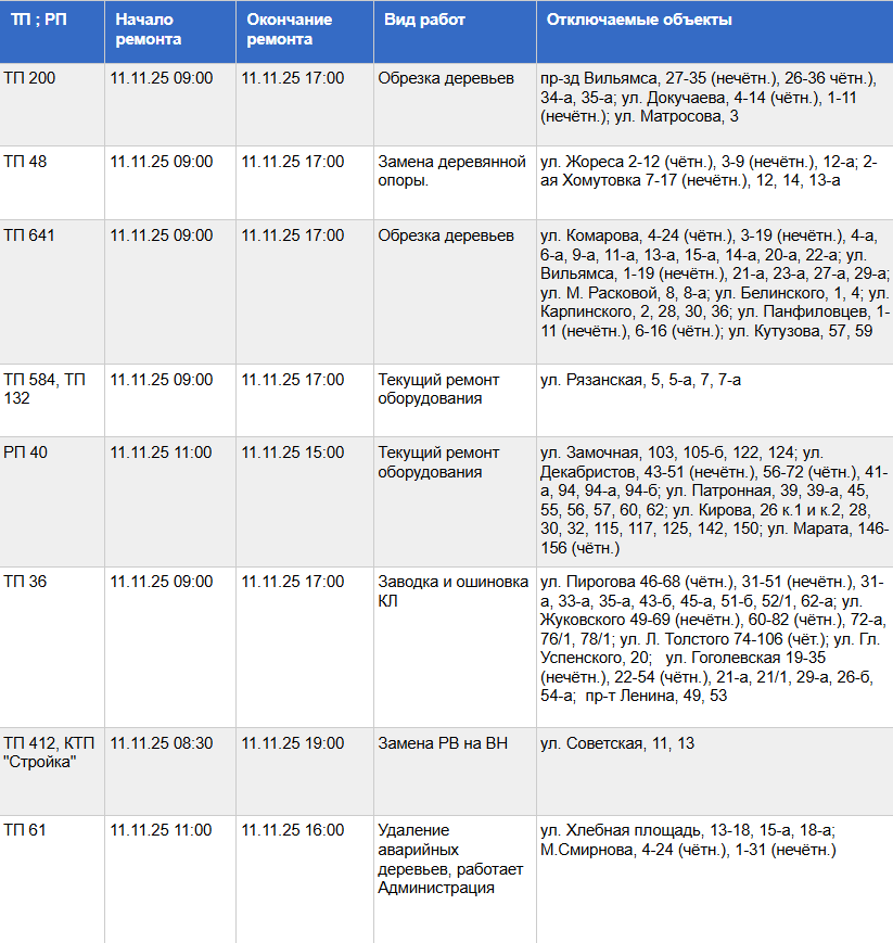 Света не будет с 08-30 до 19-00 по следующим адресам: