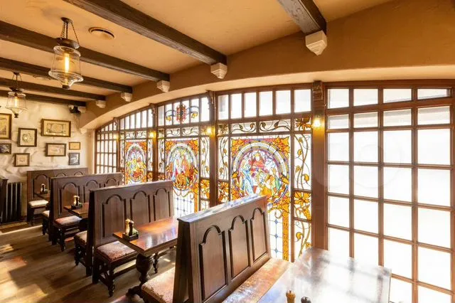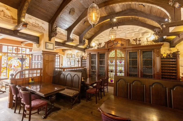 Ресторан оборудован кухонной техникой на газу, вытяжками, центральным отоплением. Есть зона разгрузки и парковка для гостей на 10 мест. Продавец делает акцент на четырехметровых потолках и уникальном ремонте с витражами и массивной мебелью.
