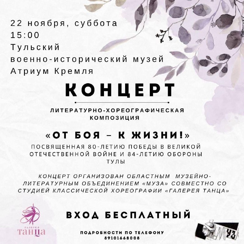 Выступление будет приурочено к 80-летию Победы в Великой Отечественной войне и 84-летию героической обороны Тулы. Мероприятие организовано совместно областным музейно-литературным объединением "Муза" и Студией классической хореографии "Галерея танца".