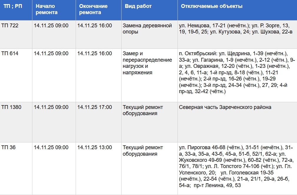 Публикуем график проведения работ и список адресов, по которым 14 ноября временно ограничат подачу электричества: