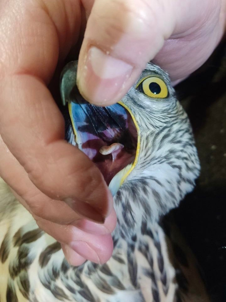 Ястреб оказался небольшой, но упитанный. Запах из клюва и черное небо говорит о кишечной инфекции.