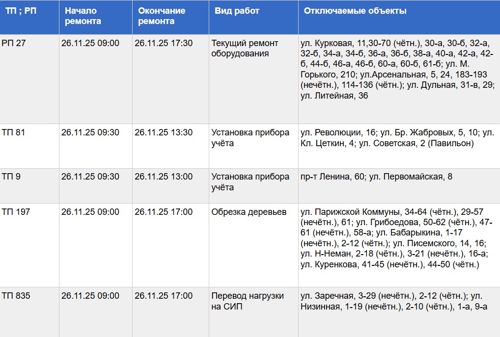 Публикуем график проведения работ и список адресов, по которым будет временно ограничено электроснабжение:
