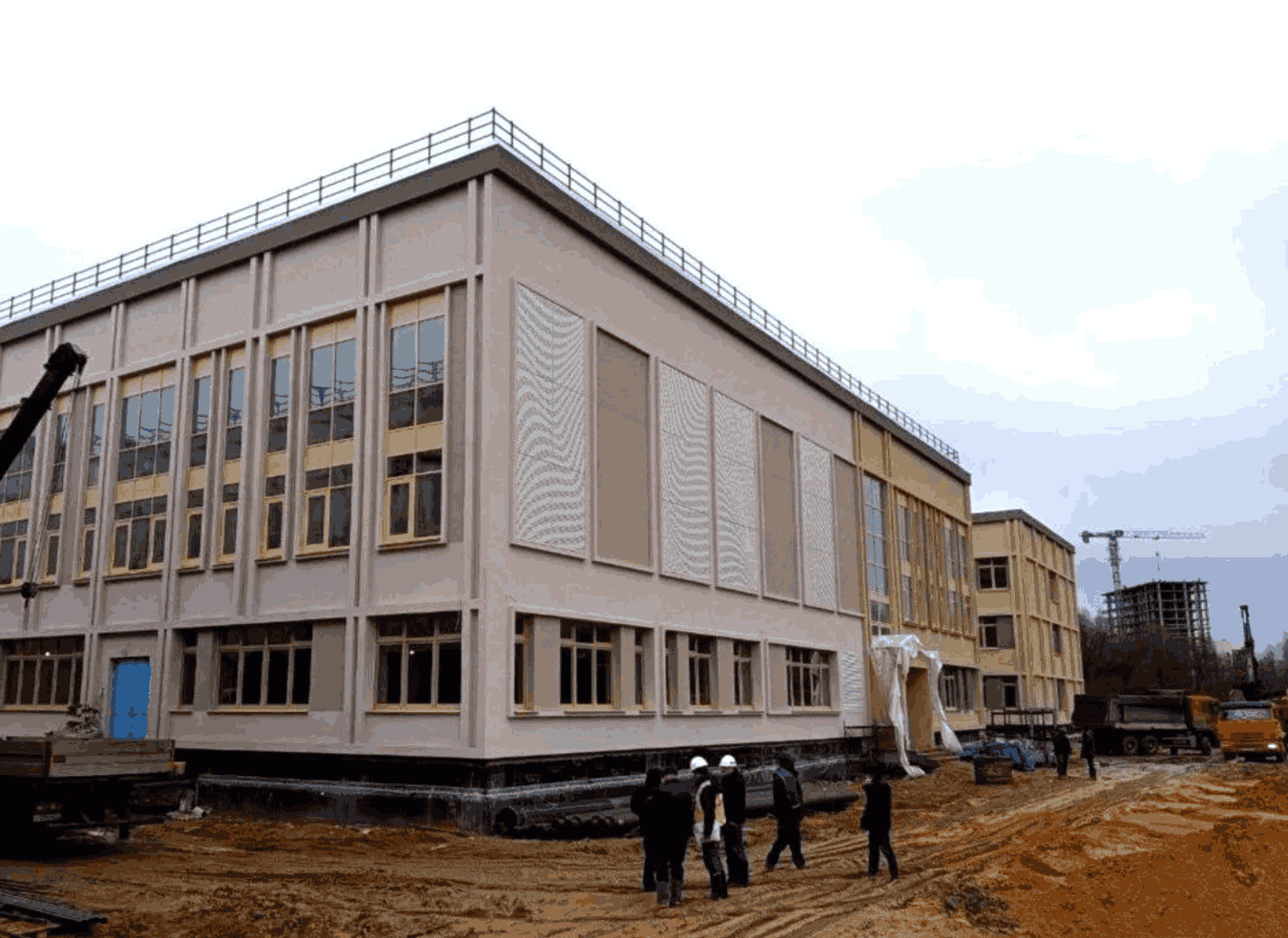 Параллельно продолжаются внутренние строительные операции: прокладываются водопроводные трубы, электрические кабели, вентиляционные воздуховоды и телекоммуникационные линии, проводится отделка поверхностей штукатуркой и шпаклёвкой, устанавливаются перегородки из стекла внутри помещений, облицовываются плитки.
