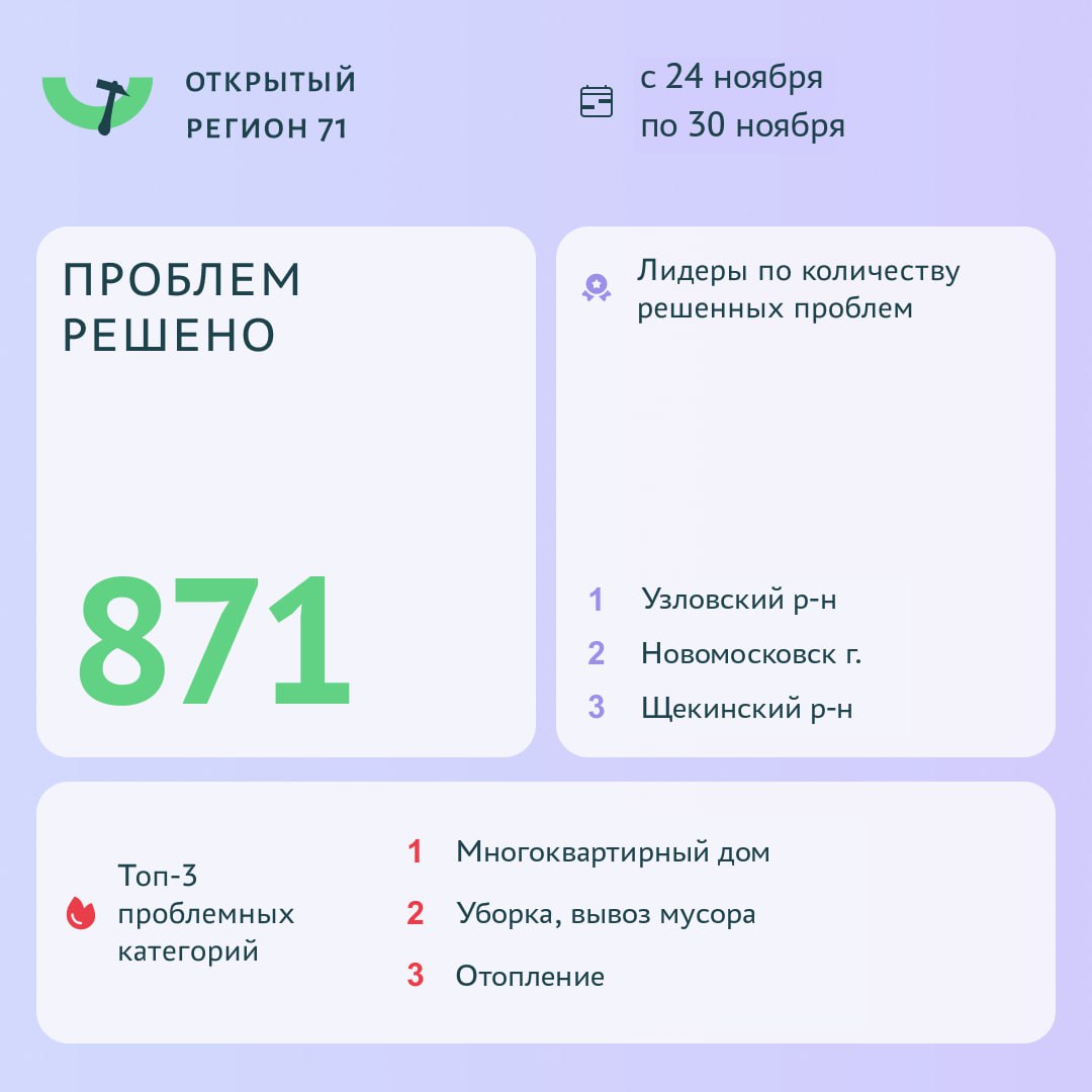 С 24 по 30 ноября самой популярной категорией недели стало обслуживание многоквартирных домов. Лидерами по количеству решенных проблем стали Узловский и Щекинский район, а также Новомосковск.