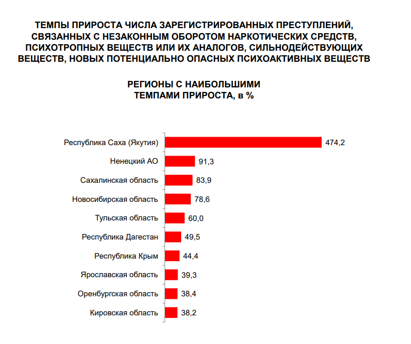 Первое место в этом рейтинге занимает Республика Саха (Якутия) – там преступления, связанные с запрещенными веществами, фиксировали на 474,2% чаще.