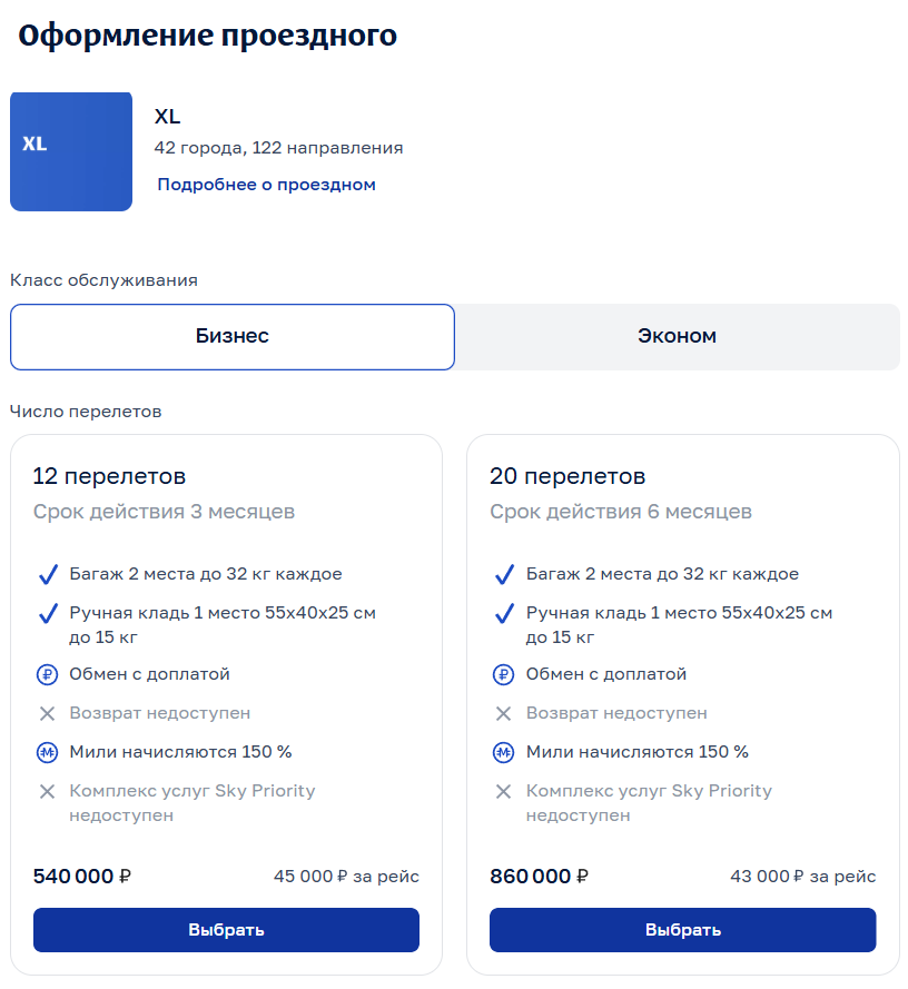 Самый дорогой проездной бизнес-класса XL на 20 перелетов стоит 860 тысяч рублей – 43 000 за рейс. Пассажир с таким проездным может выбирать из 112 направлений и 42 городов: Москва, Санкт-Петербург, Краснодар, Минеральные Воды, Калининград, Мурманск, Нижний Новгород и другие.