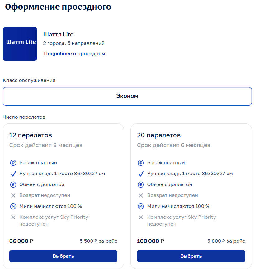 Для каждого тарифа проездного можно выбрать число перелетов – 12 или 20 – и класс обслуживания – эконом или бизнес. Также варьируется срок действия: от трех месяцев до полугода.
