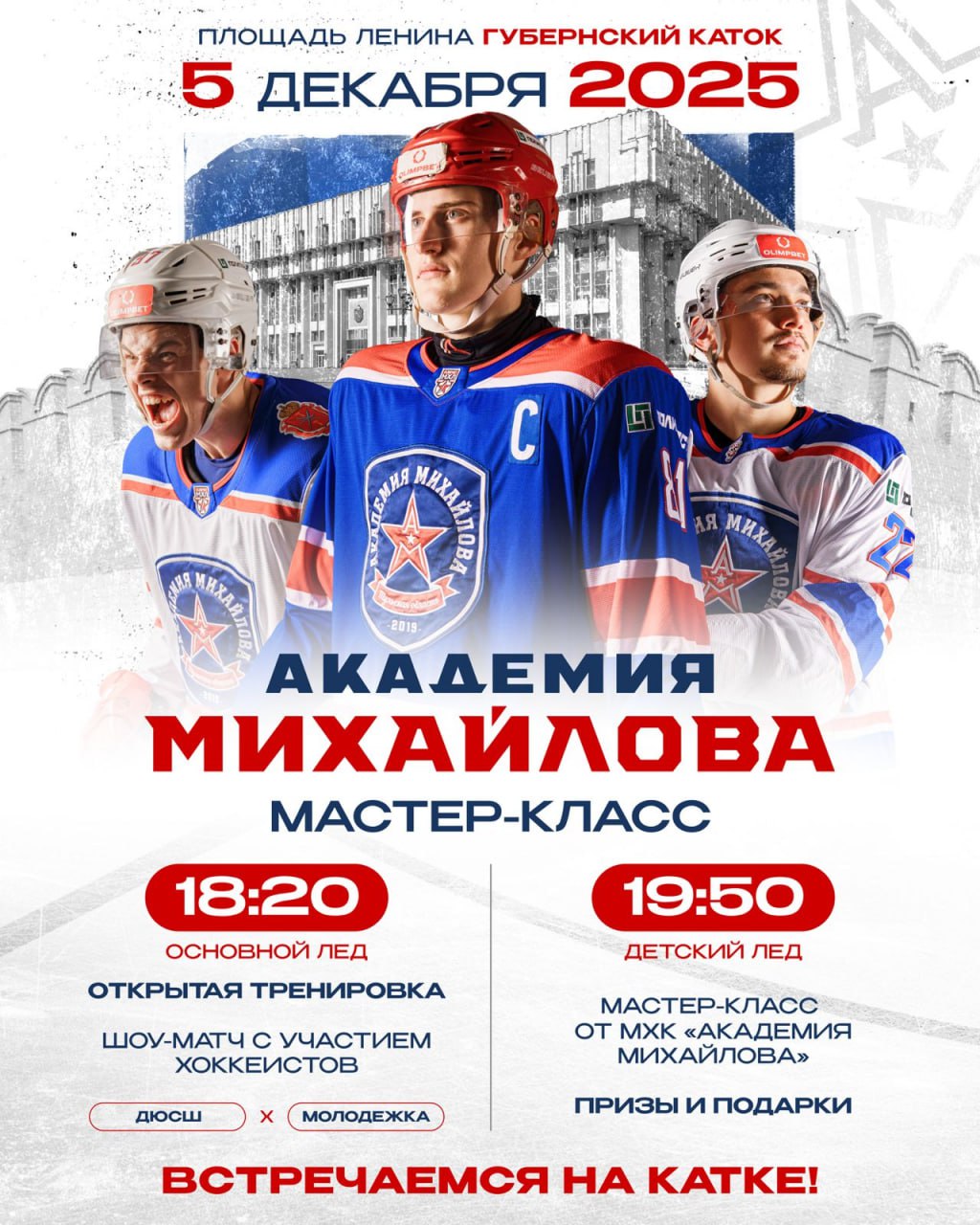 После завершения встречи, в 19-50, хоккеисты проведут мастер-класс на детском льду Губернского катка. Активные участники мероприятия получат памятные призы и подарки.