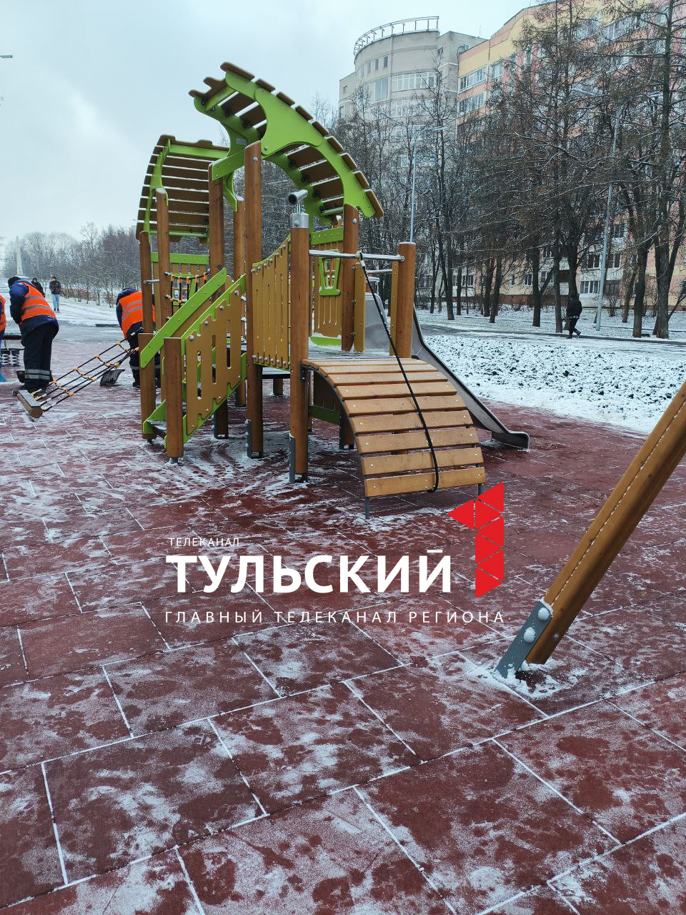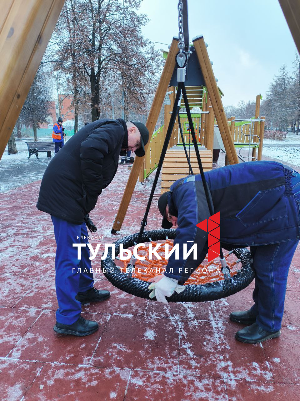 В нижней части сквера установили новое игровое оборудование. Здесь появился игровой комплекс "Робинзон", качалка для детей с ограниченными возможностями, качели "Гнездо", а также "Байк" и "Улитка".