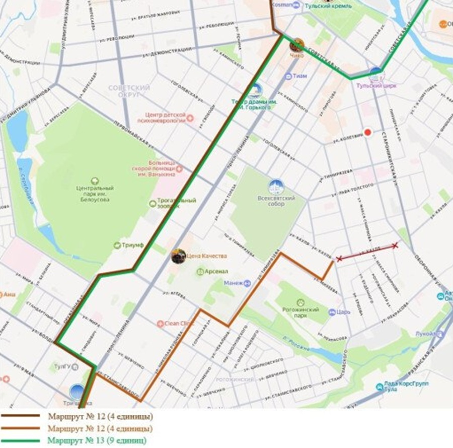 - Трамвай №13: улица Металлургов - улица Плеханова - улица Марата - улица Епифанская - улица Пролетарская - улица Советская - улица Фридриха Энгельса - улица Оружейная - улица Болдина - проспект Ленина.