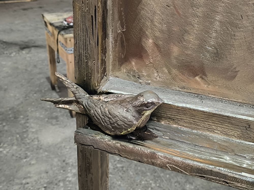 Памятник представляет собой парту и доску. На месте тетрадок и ручек расположился классный журнал с 43 именами и фамилиями красноармейцев.