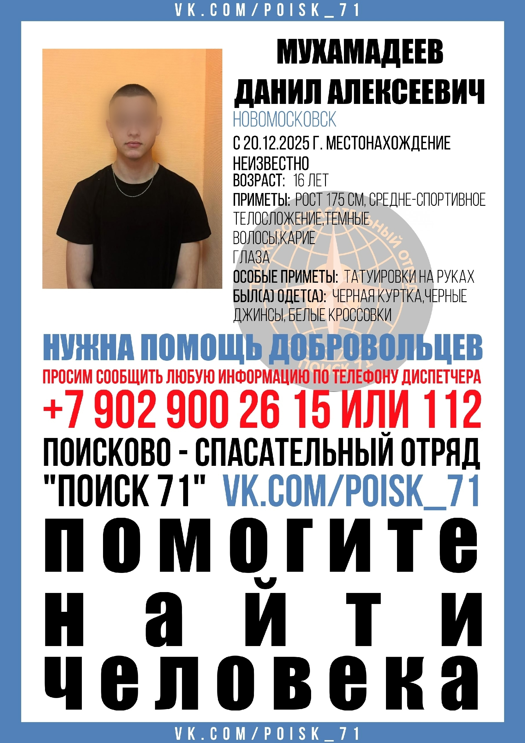 Если вам известно что-либо о местонахождении этого молодого человека, пожалуйста, позвоните по телефону 112 или свяжитесь с диспетчером поисково-спасательного отряда "Поиск 71" по номеру: 8(902)900-26-15.