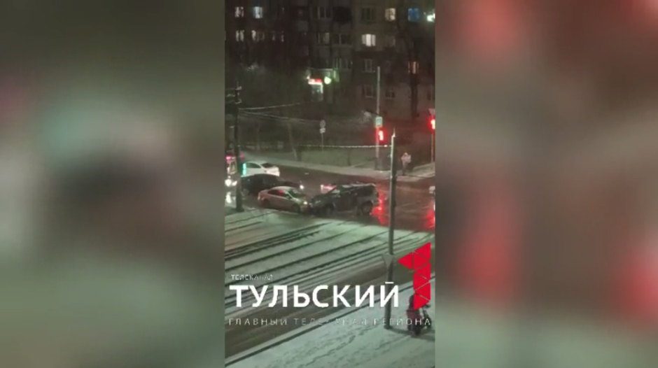 На видео видно, что кроссовер и легковой автомобиль столкнулись, перекрыв движение. Сразу три трамвая встали на перекрестке.